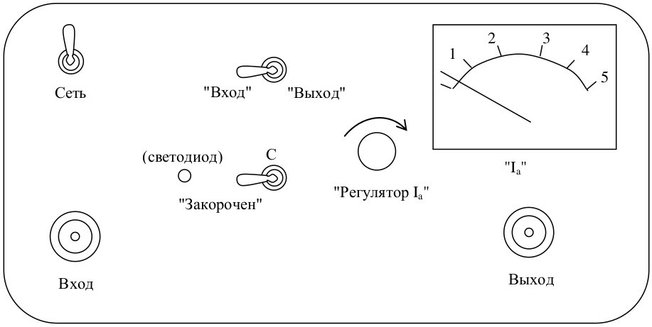 Ручка «Регулятор $I_{\text{а}}$» и стрелочный прибор «$I_а$» предназначены для установки анодного тока диода. Тумблер «$С$» предназначен для закоротки конденсатора контура при измерении коэффициента усиления усилителя. В положении тумблера «Закорочен» горит индикатор закоротки «И», напоминающий о том, что конденсатор замкнут (это нужно для измерения коэффициента усиления усилителя), но что в режиме измерения шумов его нужно будет не забыть разомкнуть. Тумблер «Вход/Выход» предназначен для переключения вольтметра со входа на выход усилителя (при измерении $K_y$).