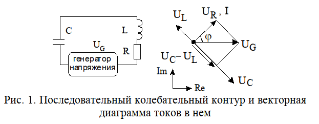 Схема последовательного колебательного контура приведена на рисунке 1, где буквами $U_{G} $ $R$, $L$ и $C$ соответственно обозначены источник переменного гармонического напряжения, сопротивление, индуктивность и конденсатор. Падение напряжение на этих элементах выражается следующим образом (см. ч. I, 1.1-1.3) \[U_{R} =I\cdot R, U_{L} =L\cdot \frac{dI}{dt} , U_{C} =\frac{Q}{C} =\frac{1}{C} \int I(t)dt . \] Если задать переменное напряжение источника в виде гармонической функции с частотой $\omega =2\cdot \pi \cdot f$: \[U_{G} (t)=U_{0} \cdot \sin (\omega \cdot t), \] то установившийся ток в цепи с линейными элементами будет также гармонической функцией с той же частотой, но, в общем случае, с другой начальной фазой $\varphi $: \[I(t)=I_{0} \cdot \sin (\omega \cdot t)\] \begin{equation} U_{R} =I_{0} \cdot R\cdot \sin (\omega \cdot t)=U_{R} \cdot \sin (\omega \cdot t) \ \ \ \ \ (1) \end{equation} \begin{equation} U_{L} =I_{0} \cdot L\cdot \omega \cdot \sin (\omega \cdot t+\pi /2)=U_{L\, } \cdot \sin (\omega \cdot t+\pi /2) \ \ \ \ \ (2) \end{equation} \begin{equation} U_{C} =I_{0} \cdot \frac{1}{\omega \cdot C} \cdot \sin (\omega \cdot t-\pi /2)=V_{C} \cdot \sin (\omega \cdot t-\pi /2) \ \ \ \ \ (3) \end{equation}