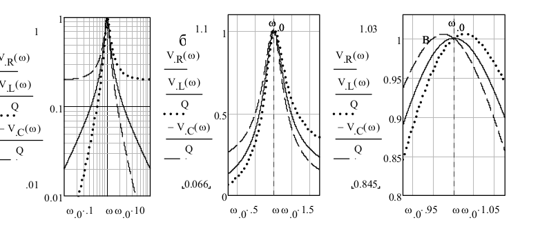 Рис. 2. Зависимость напряжения (в вольтах) на элементах последовательного колебательного контура $R$, $L$ и $C$ от частоты для разных интервалов перестройки частоты внешнего сигнала (а, слева) $0.1\cdot \omega _{0} <\omega <10\cdot \omega _{0} $, (б, в центре)- $0.5\cdot \omega _{0} <\omega <1.5\cdot \omega _{0} $ (в, справа) $0.05\cdot \omega _{0} <\omega <1.05\cdot \omega _{0} $. Величины напряжений $U_{L} $ и $U_{C} $ уменьшены в $Q$ раз, где добротность $Q$ определяется формулой (10). Напряжение на генераторе 1 вольт, $Q=5$.