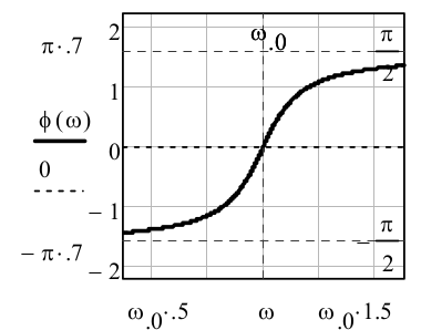 Рис. 3. Частотная зависимость разности фаз напряжения источника и тока в цепи для последовательного колебательного контура. Штриховые линии соответствуют значениям фазы $\pm \frac 12 \pi $ Диапазон изменения частоты $0.5\cdot \omega _{0} <\omega <1.5\cdot \omega _{0} $.