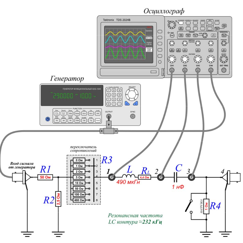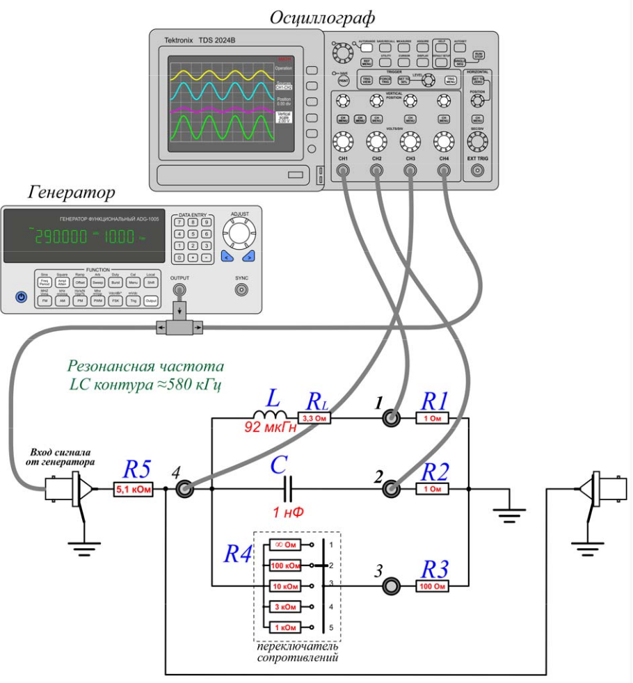 Внутреннее сопротивление используемого в работе генератора составляет 50 Ом и является сравнимым или даже большим по отношению к характерным активным и реактивными сопротивлениям. Выход модифицированного генератора с сопротивления R2 позволяет уменьшить эквивалентное внутреннее спротивление до 2.5 ома ценой значительного уменьшения подаваемого на контур переменного напряжения. Тем не менее, при минимальном сопротивлении нагрузки, возможном в схеме и равном $R=R_{L}=4.4$ Oма, условие большой малости выходного сопротивления генератора напряжения $R2 \ll R$ выполняется не достаточно хорошо и должно быть учтено при анализе результатов. Схема даёт возможность измерения напряжения непосредственно с сопротивления $R2.$ Появление сопротвления $R_L$ связано с тем, что реактивные элементы, и особенно индуктивность, не являются идеальными и обладают активными потерями. Для катушки индуктивности потери связаны с активным сопротивлнием ($R_L$) провода, которым намотана катушка. В данной схеме $R$ представляет собой минимальную величину активной нагрузки $R,$ используемой в теоретических формулах 1–11 выше, $R=(R_L+R3+R4).$ Сопротивление $R3$ переменное и служит для изменения уровня активных потерь в контуре, а $R4$ используется для измерения тока в цепи контура. Падение напряжения на активных элементах контура измерить непосредственно без изменения схемы невозможно. Это связано с тем, что внешний контакт коаксиальных разъёмов, на генераторе и осциллографе заземлён. Поэтому напряжение в точке 2 на схеме измеряется относительно земли и состоит из падения напряжения на конденсаторе $С$ и на сопротивлении $R4.$ Поскольку вкладом последнего можно пренебречь из за его относительной малости, то напряжение в точке 2 соответсвует падению напряжения на конденсаторе С. Напряжение между точками 1 и 2 может быть определено с помощью вычитания сигналов с соответствующих каналов непосредственно на осциллографе. Такая операция может быть выбрана из меню, включаемого кнопкой «math menu» на осциллографе. Сигналы, подаваемые на осциллограф с контура, особенно с сопротивления $R4,$ имеют малую величину и могут искажаться высокочастотными хаотическими шумами осциллографа, которые уширяют линии осциллограмм. Для уменьшения этого эффекта следует использовать усреднение осциллограмм, которое можно выбрать из меню, включаемого кнопкой «acquire», расположенной в верхнем ряду кнопок панели управления осциллографа. В меню вместо «sample» нужно выбрать «aver 16», принимая во внимание при этом, что реакция осциллограмы, на изменение условий в контуре, например, частоты генератора, будет в режиме усреднения осциллограмм немного замедленной.