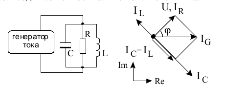 Рис. 5. Параллельный колебательный контур и векторная диаграмма токов в нем